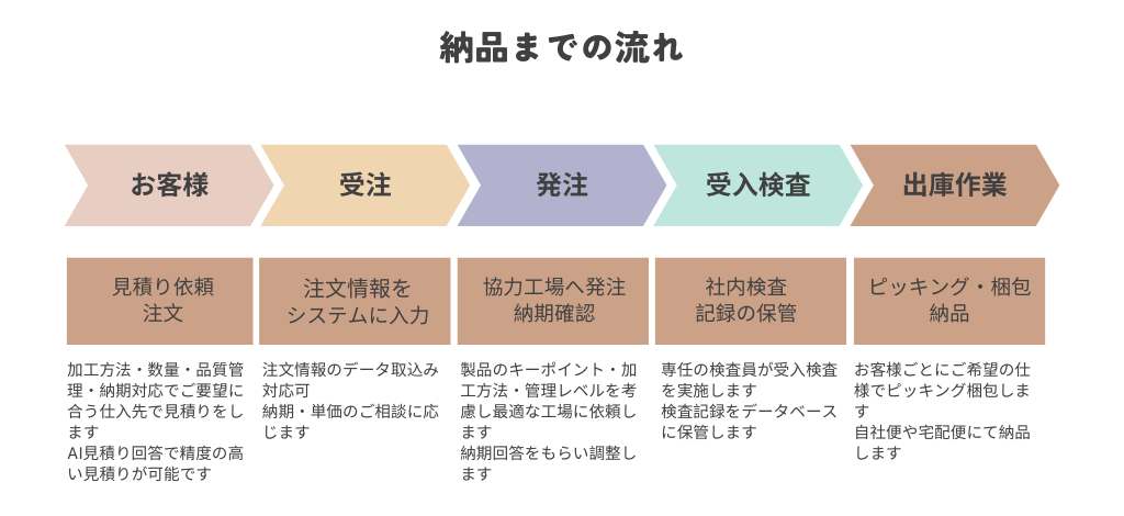 不良品の早期発見、流出防止し品質の安定により安心してご注文いただける環境づくりを目指しております。